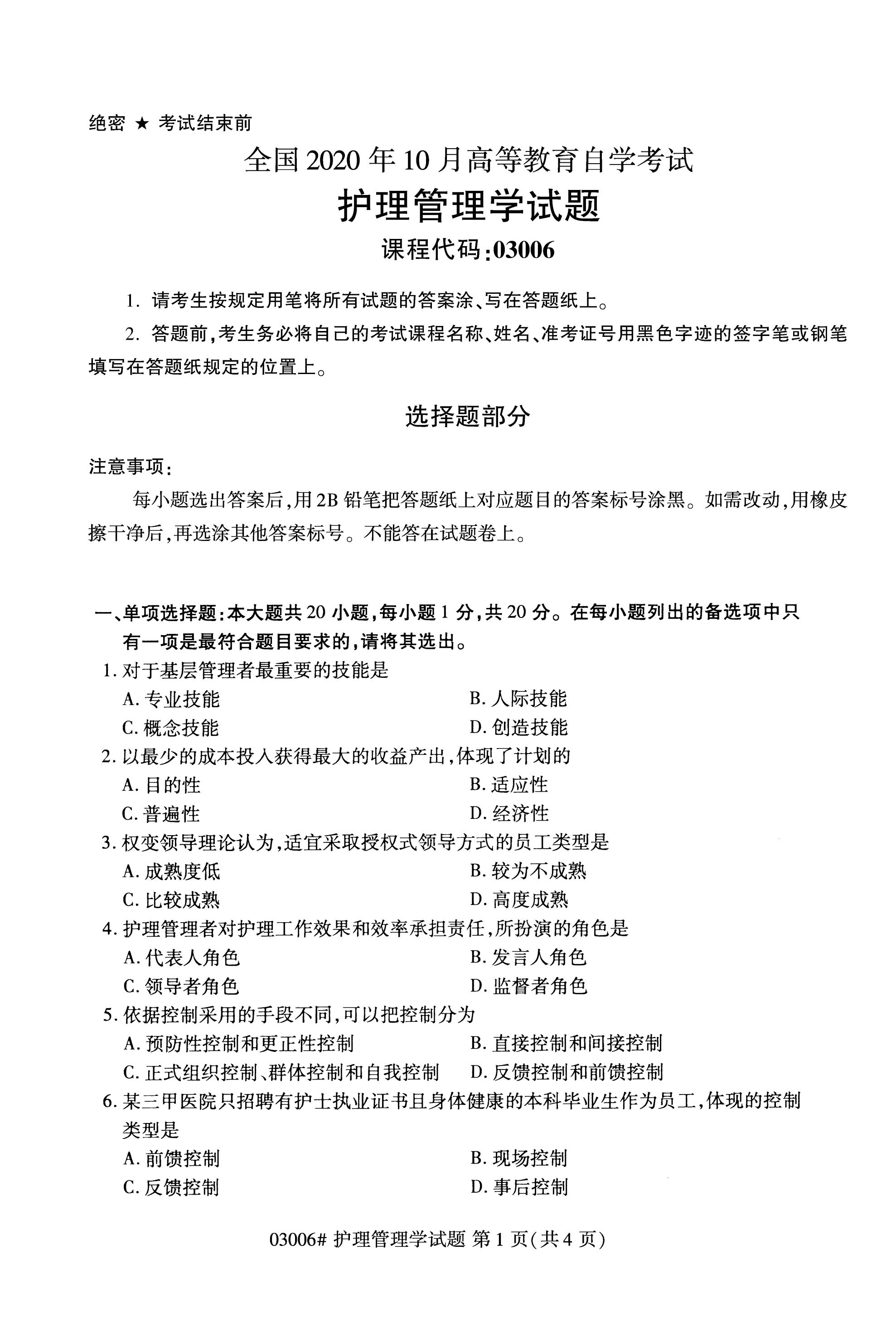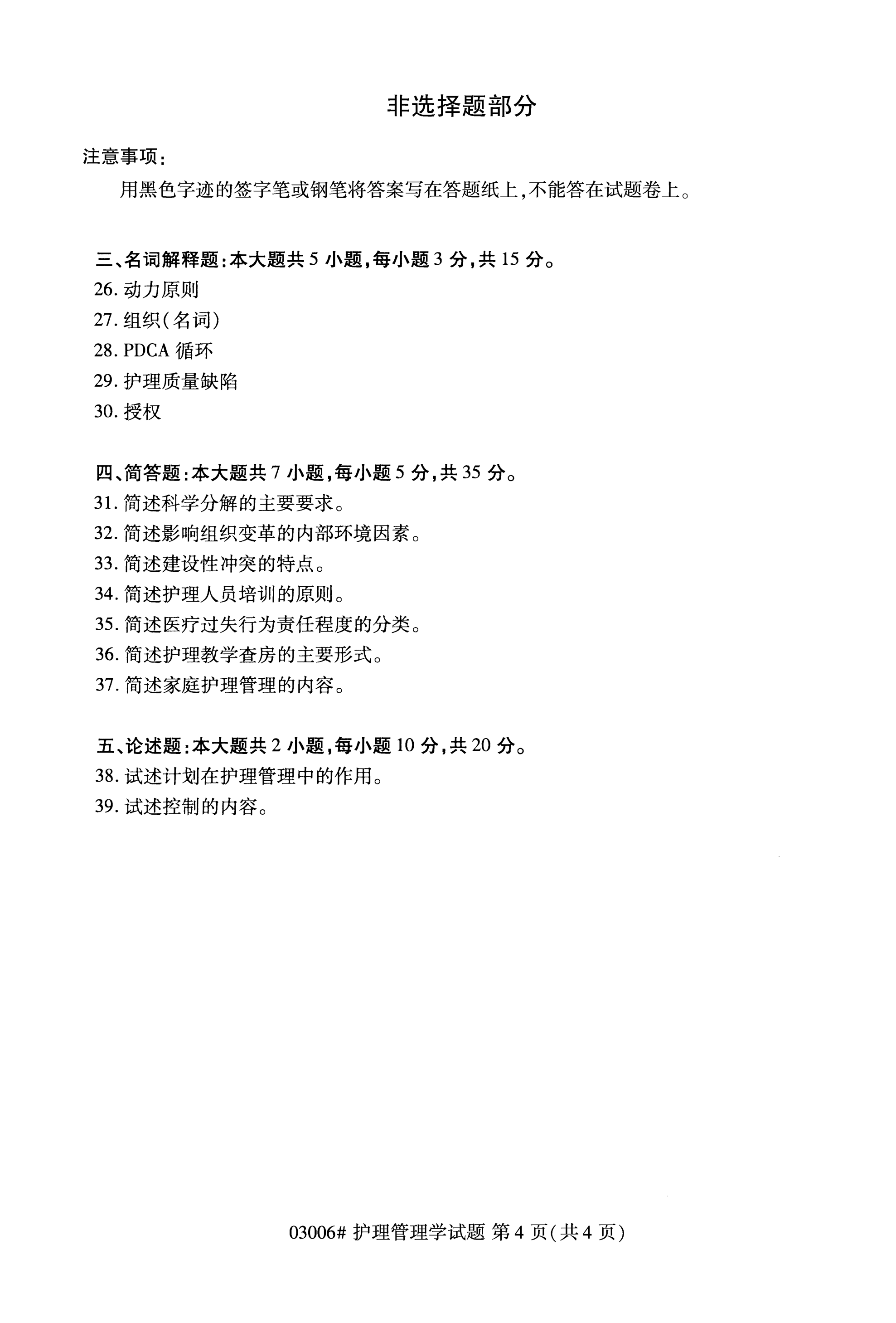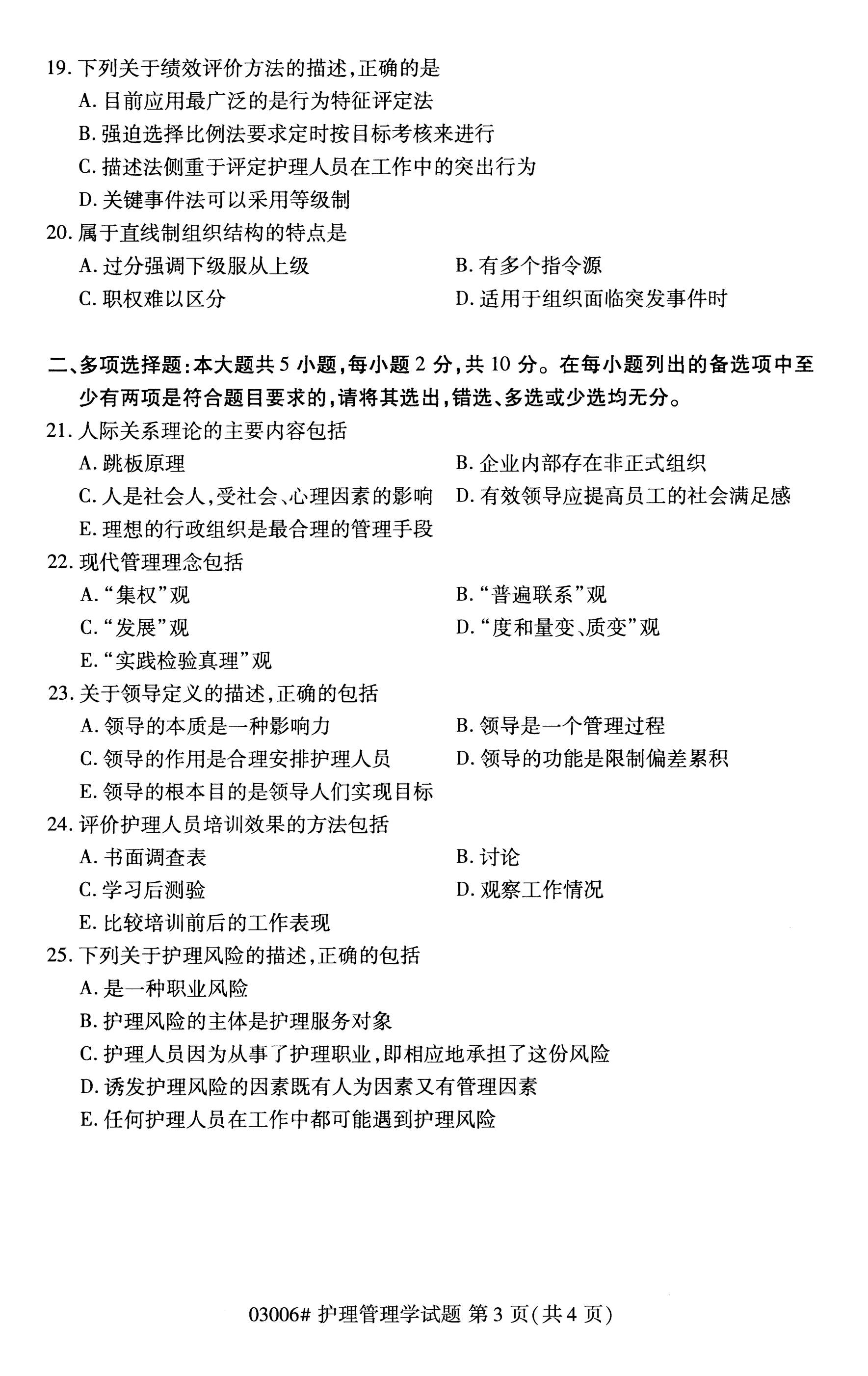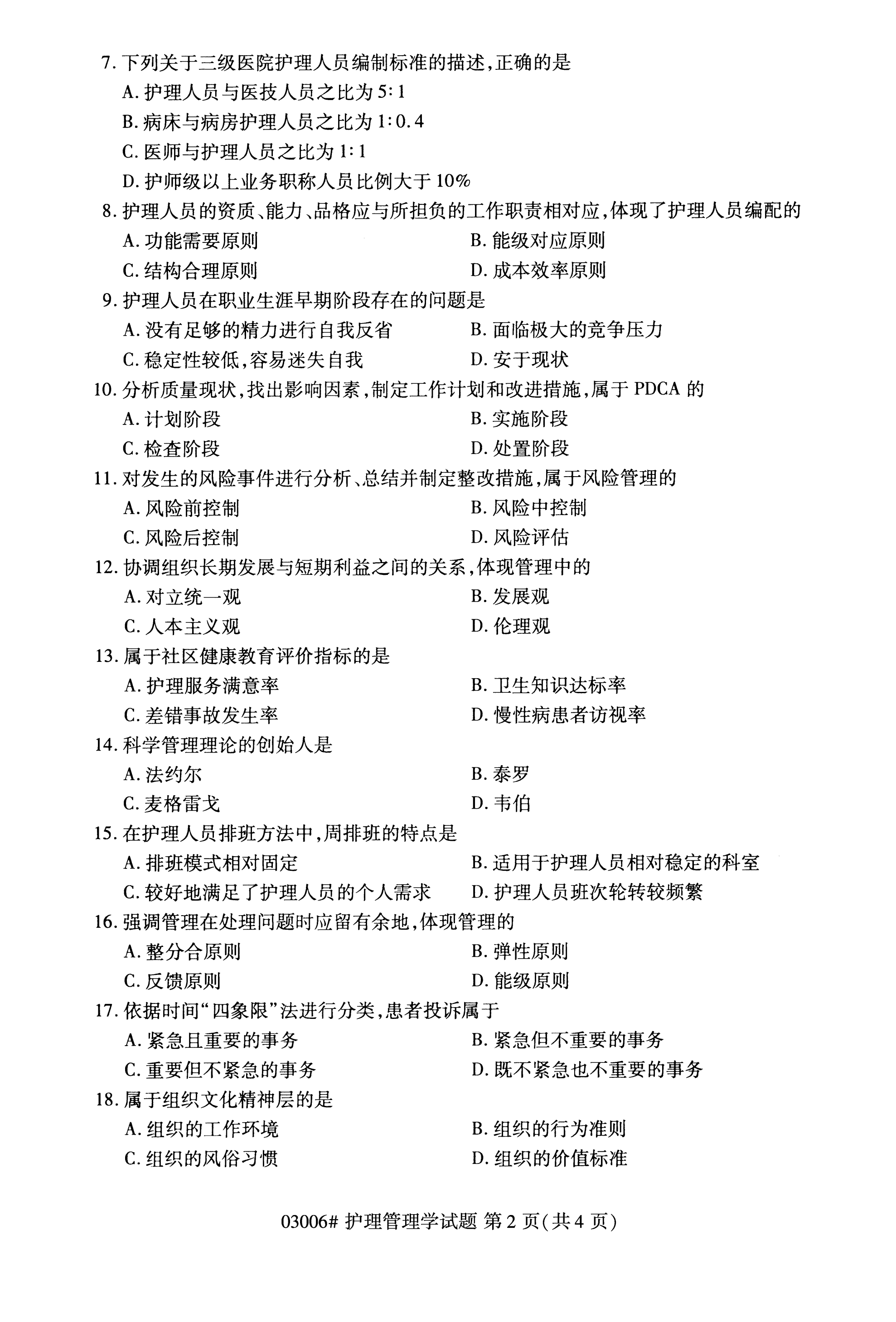 福建成人自考全國卷護理管理學(03006)試題